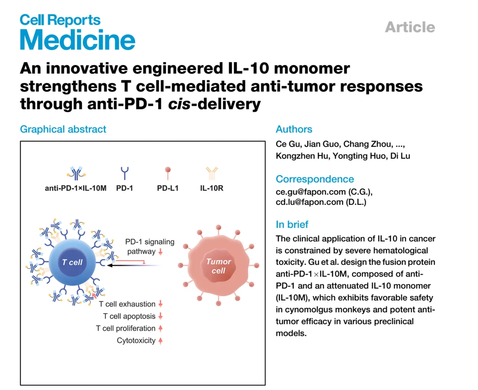 Fapon Biopharma Publishes Pioneering Research in Cell Reports Medicine on FP008, an anti-PD 1 X IL-10M Fusion Protein for Cancer Immunotherapy